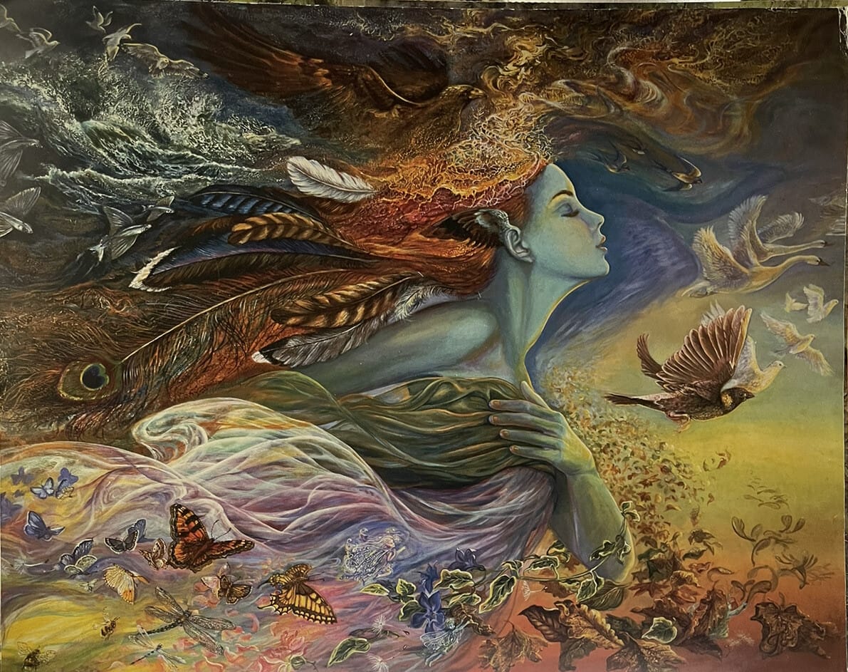 To gaze upon a painting by Josephine Wall is to step into a kaleidoscope of joy and spiritual awakening. Her art is an explosion of vibrant color, flowing lines, and surreal imagery that feels like a direct download from the collective unconscious of Faerie. Butterflies, goddesses, mythical creatures, and swirling cosmic energies dance across her canvases.